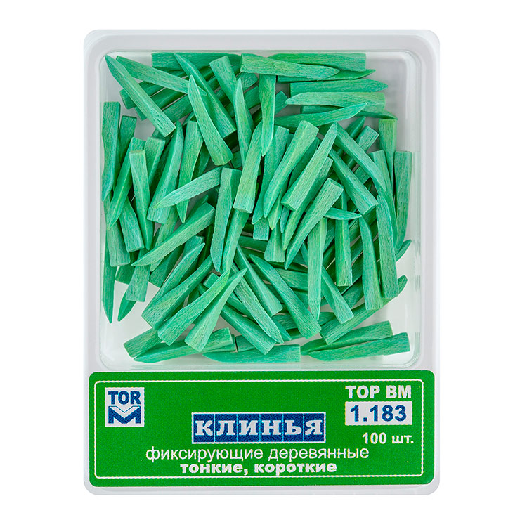 ТОР ВМ Клинья фиксирующие 1.183 деревянные, цвет зеленый, 100 шт. применяются для создания межзубного промежутка при установке матриц или сепарационных пластин, а также для дополнительной фиксации матриц и обеспечения лучшего их прилегания к поверхности зуба. Иногда клинья могут быть использованы с целью создания межзубного промежутка при обработке поверхности пломб полосками щлифовальными. Такой прием уменьшает износ поверхности полосок, тем самым увеличивая эффективность шлифования. Боковые вогнутые поверхности клиньев соответствуют морфологии зубов. Клинья фиксирующие деревянные изготавливаются из клена.